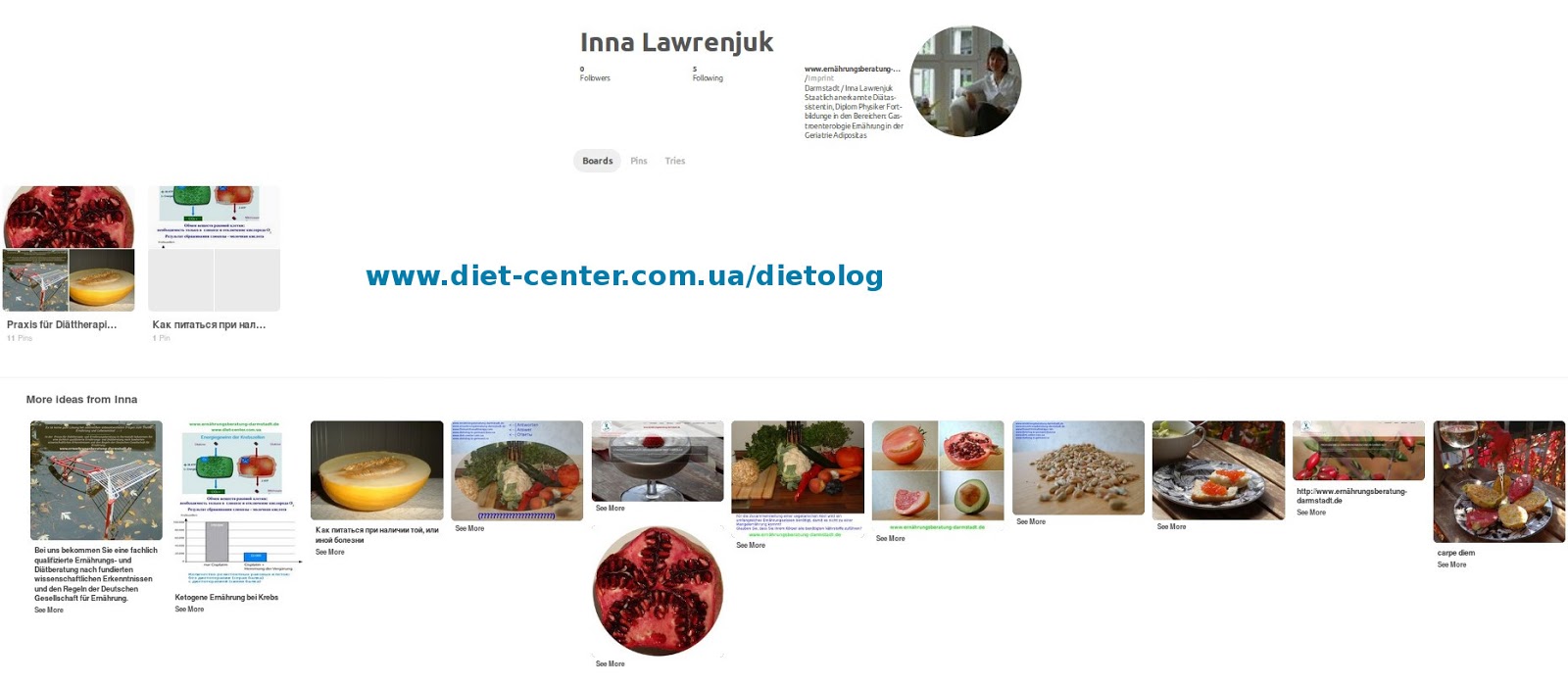 диетолог Инна Лавренюк консультировала в клинике "Инновация" (г. Киев) . В дальнейшем, консультации диетолога проводятся, как и прежде, в Германии, г. Дармштадт (Darmstadt), а также в режиме онлайн (Skype, Viber, Whatsapp). Предварительная запись проводится в форме обратной связи на страницах: "Контакт" или "Contact"